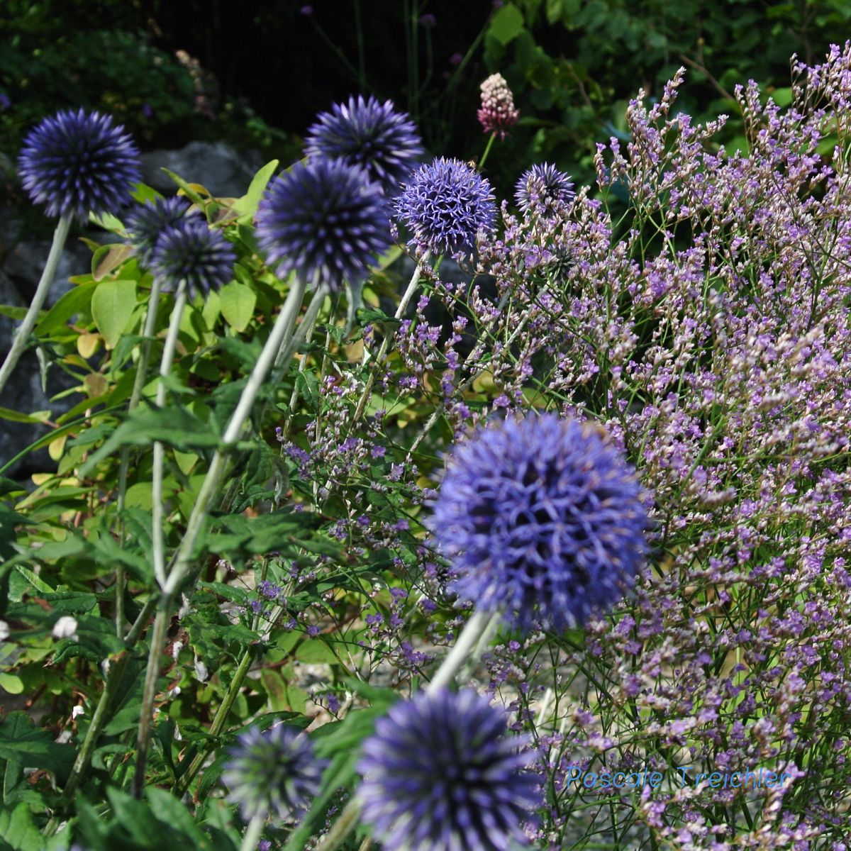 Dieses unbekannte Kraut mit blauen Kugeldisteln. Die sind ein tolles Team.