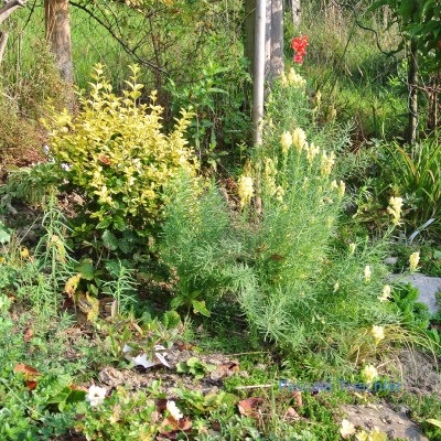 Das gelbe Beet ist gerade kein schöner Anblick, darum habe ich hier nur einen kleinen Ausschnitt genommen. Dies sind irgendwelche wilden Löwenmäulchen, die ich letztes Jahr an einer Böschung mitlaufen liess, daneben leuchtet der Goldliguster.