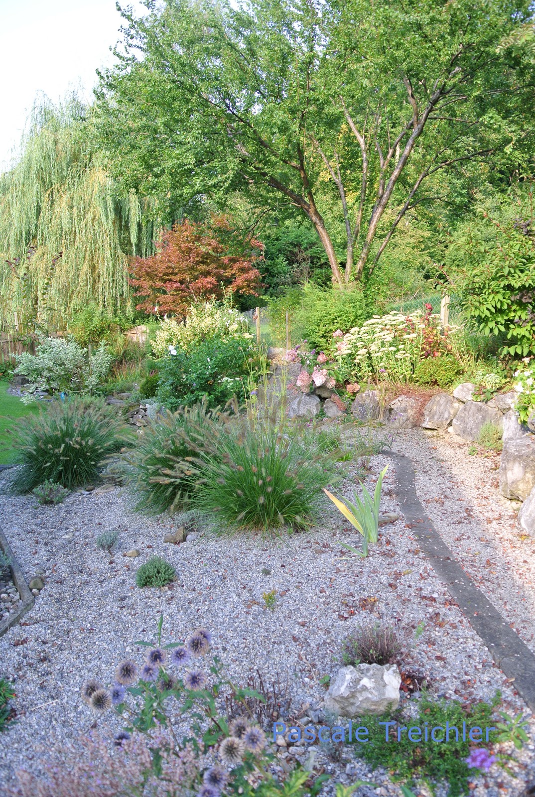 Das Kiesbeet wurde von den Gräsern übernommen. Sie dominieren diesen Blick jetzt vollkommen.