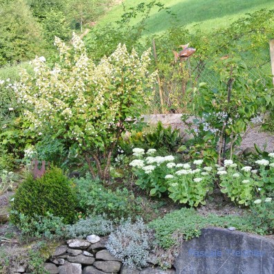 Das weisse Beet startet z um letzen Höhepunkt mit weissen Fetthennen, Rispenhortensien, einer Staudenclematis im Flieder und im Hintergrund den hohen Herbstanemonen.