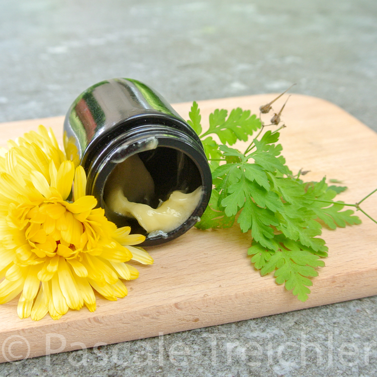 Wir verwenden ihn als Bestandteil unserer Wundheilsalbe, da er auch blutstillend ist. Hier zusammen mit Ringelblumen und Arnika.
