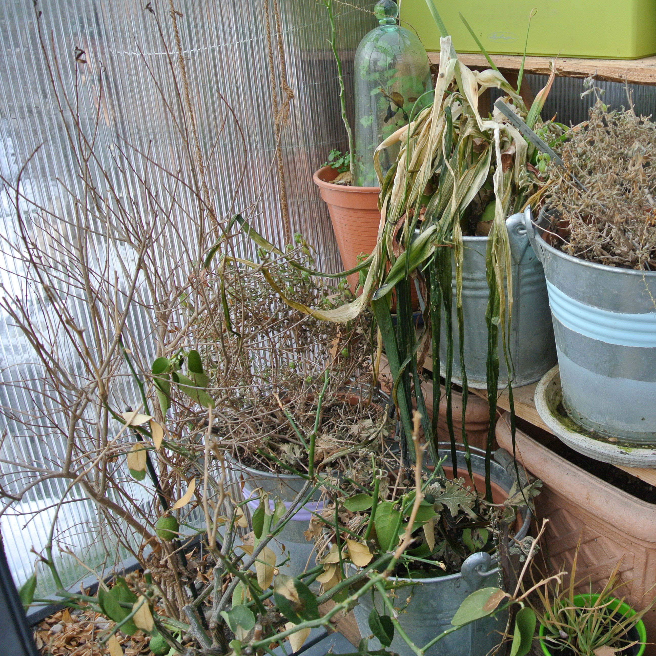 Der Schaden im Gewächshaus ist zum Glück kein Totalausfall, aber die Pflanzen haben sehr gelitten, dass im Dezember das Fenster während mehreren Nächsten offen war und der Frost eindringen konnte. Zwei oder drei werden wahrscheinlich nicht zu retten sein. Das Zitronengras ist in sehr bedauernswertem Zustand und die Zitronenverbenen sind fast tot, ich denke die sind hinüber. Der Ingwer hat die Kälte wohl auch nicht überlebt.