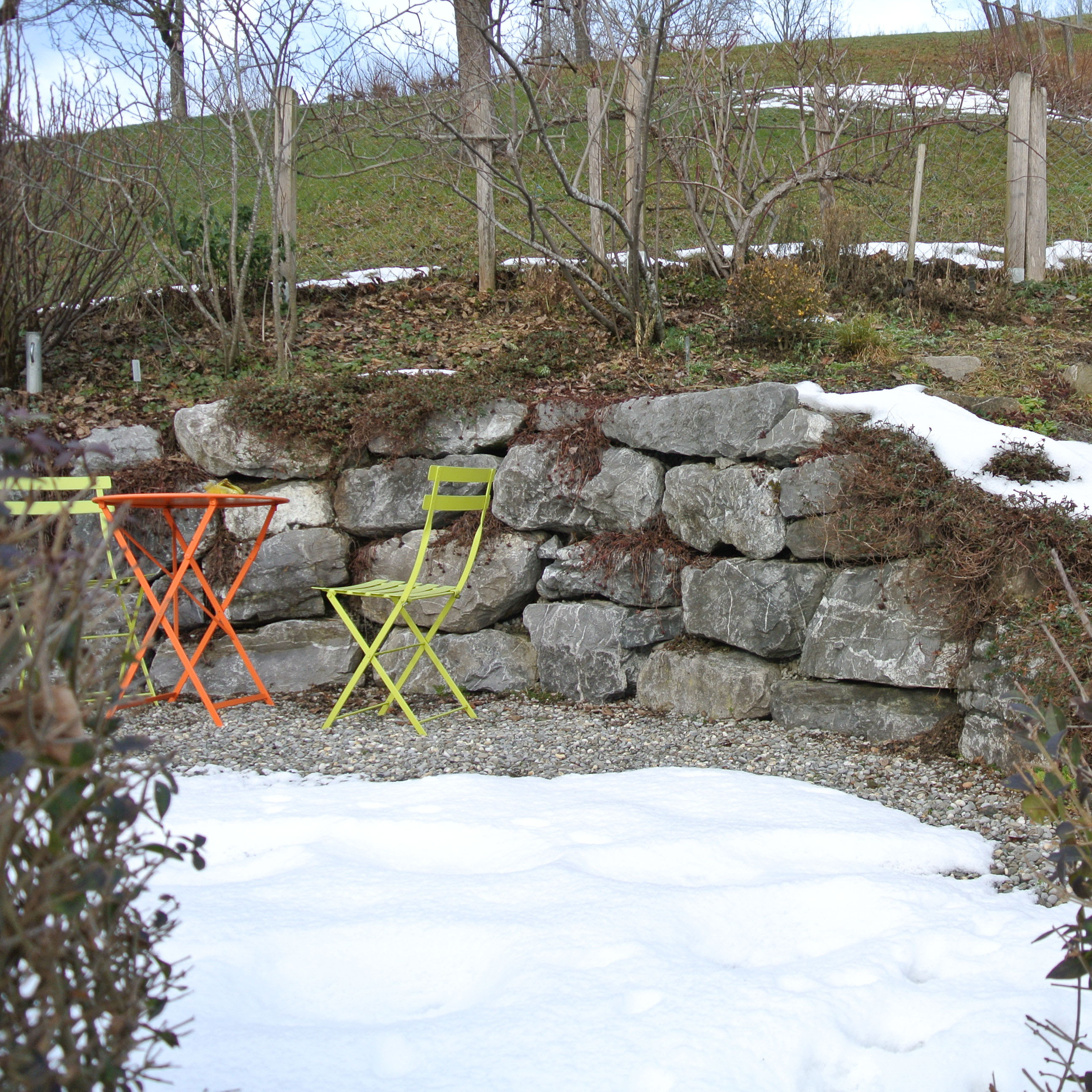 Auch die Vögel bringen im Winter Leben in den Garten. Sie finden in der naturnahen Hecke eigentlich genug Futter. Doch ich sehe sie gerne an der Futterstelle picken. Damit alle etwas davon haben, streue ich den Amseln, dem Dompfaff und den Rotkehlchen am Boden Weichfutter mit Beeren und getrockneten Mehlwürmern hin, während die Meisen und Spatzen sich in den Ästen an den Knödeln und den Körnern gütlich tun.