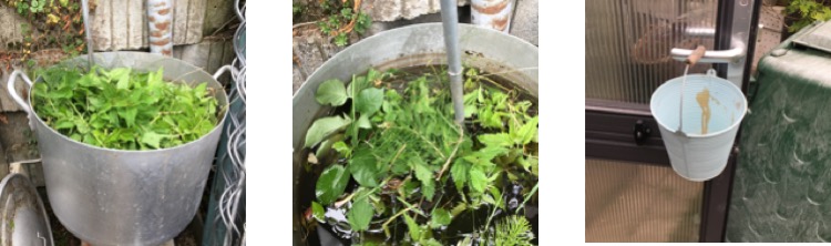 Damit ich das Düngen nicht vergesse hängt ein kleiner Kessel an der Türe vom Gewächshaus, den fülle ich mit Jauche und ab damit ins Giesswasser.