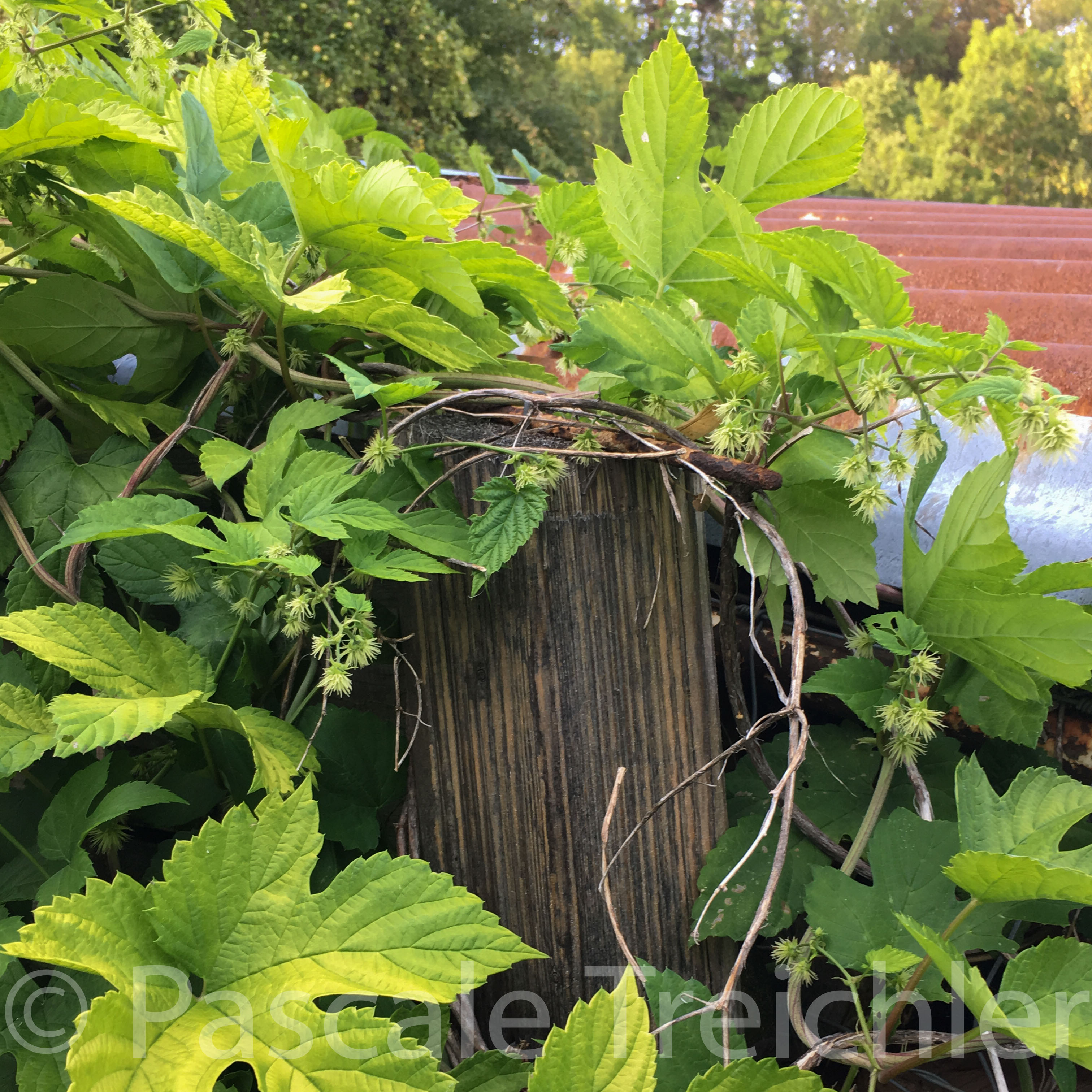 Nutzt Du den Hopfen ? Er ist in unserem Garten vor allem eine Zierpflanze, die sich an der Leiter aus Haselholz hochwindet und den Sommer über eine hässliche Aussicht verdeckt.