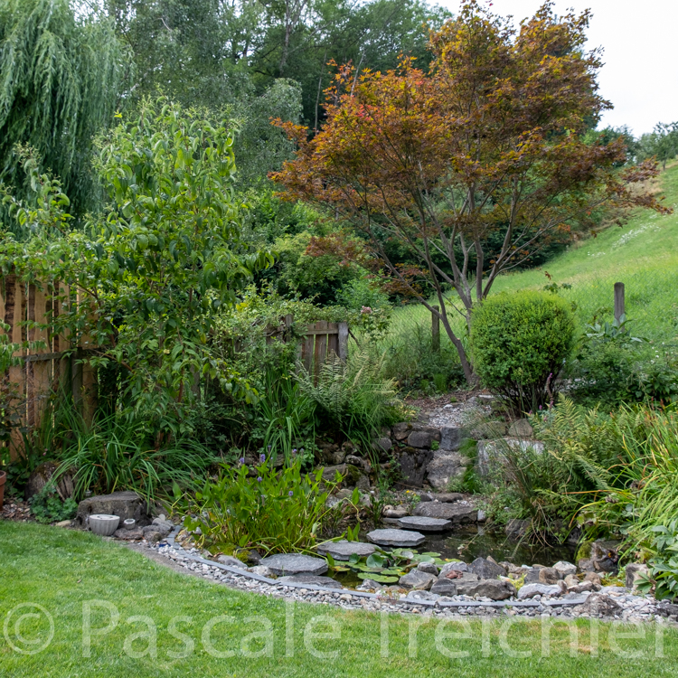 Die pinke Seerose schiebt immer mal wieder eine Blüte, während das Hechtkraut in seinem tollen Blau dahinter steht. Im Hintergrund öffnet die Rose Mozart nächstens ihren zweiten Flor und blüht dann bis zum Frost durch.