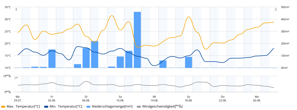 Der Blick auf die Wettergrafik zeigt, dass wir hochsommerliche Temperaturen hatten und einige Gewitter mit relativ viel Regen.