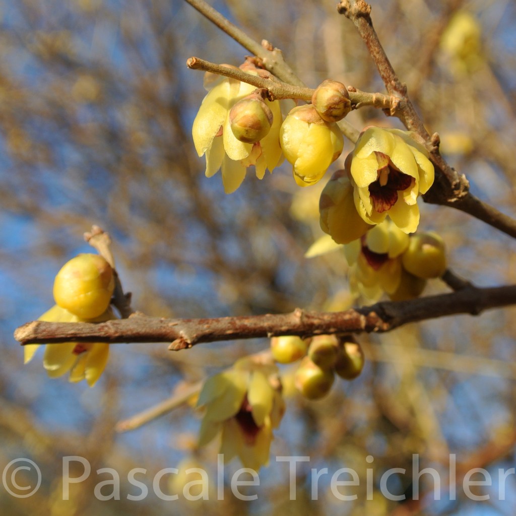 Auf den Mauerbeeten fangen die Winterblüher an zu brillieren. Der Chimonanthus precox schiebt gelbe Blüten (Bild unten: rechts). Der Winterschnee ball bildet rosa-weisse Blütenbälle.