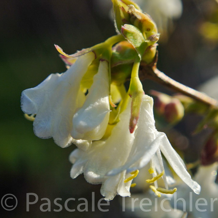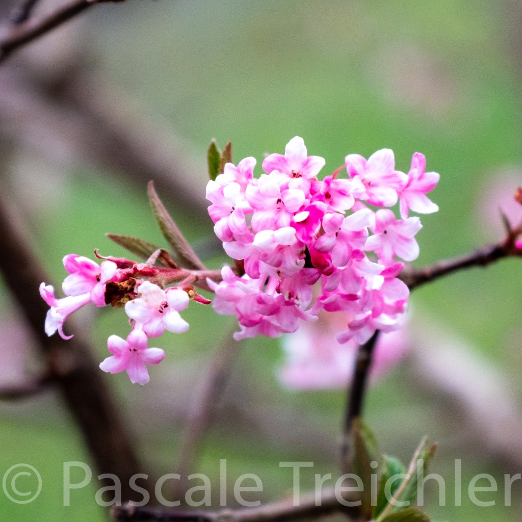Die Grundfarbe ist braun. Vertrocknete Hortensienblüten und Erde. Aber hier blüht ein Winterschätzchen: Die Lonicera purpusii, die Winter-Duftheckenkirsche. So was zartes und feinduftendes.