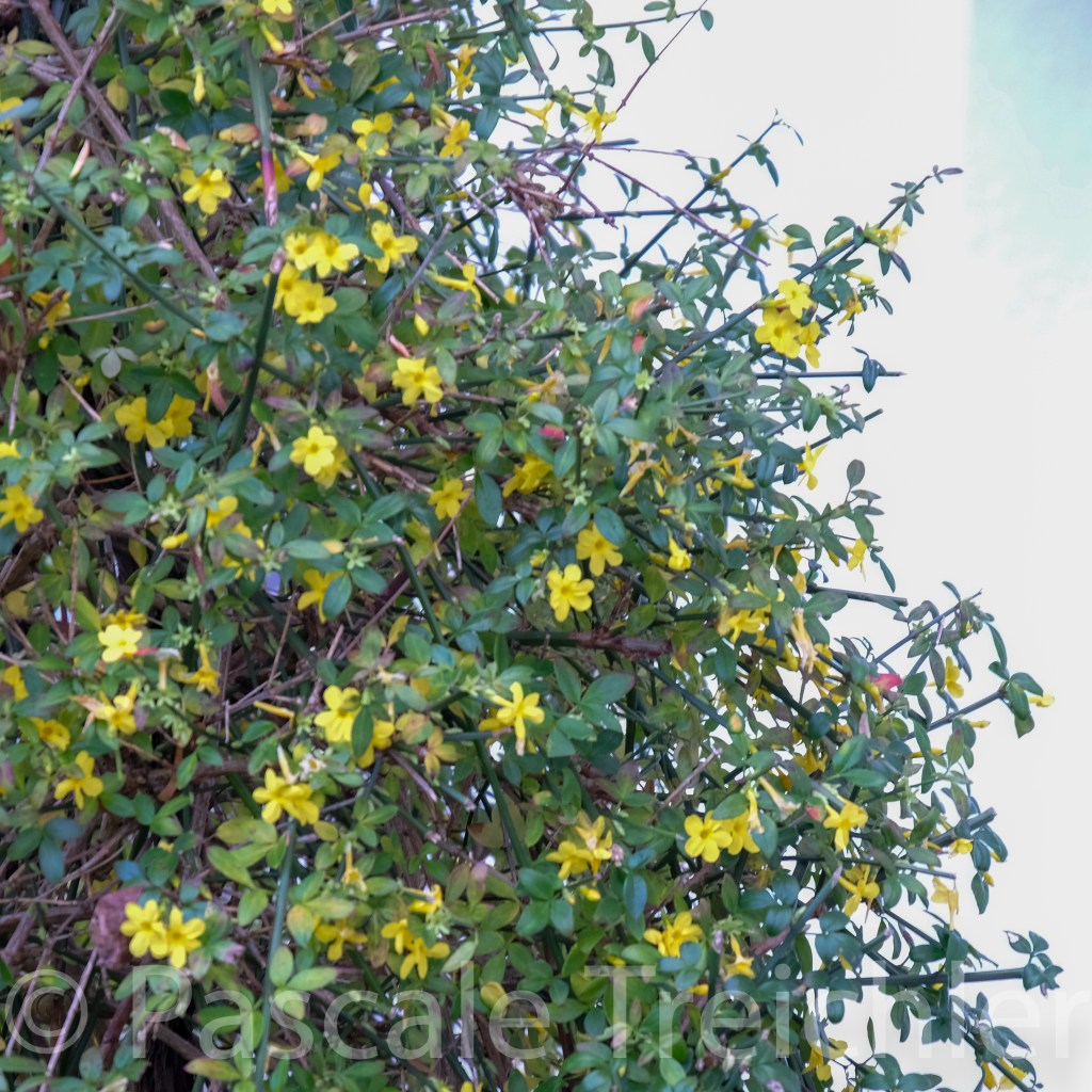 Am mittleren Rosenbogen jedoch hat sich der Winterjasmin in goldene Sterne gehüllt. Die gelben Blüten werden vom Herrhutterstern unterstützt. Es werden jetzt täglich mehr bis hier eine gelbe Säule leuchtet.