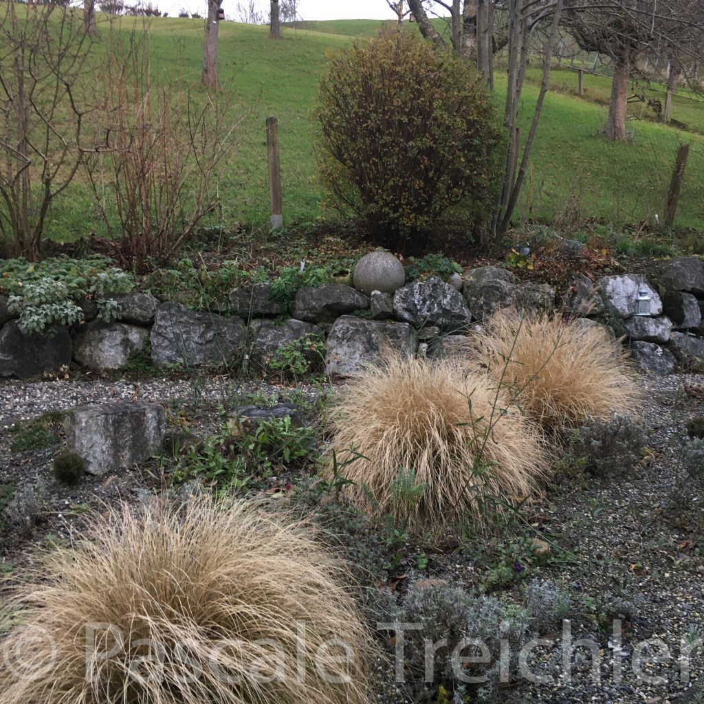 Im Kiesbeet ist Winterpause. Ich weiss nie recht wann ich die Gräser schneiden soll. Schneide ich sie jetzt, habe ich den ganzen Winter über diese unschönen Stoppeln stehen. Schneide ich sie im Spätwinter, kann es sein, dass ich bereits die neuen grünen Triebe erwische.