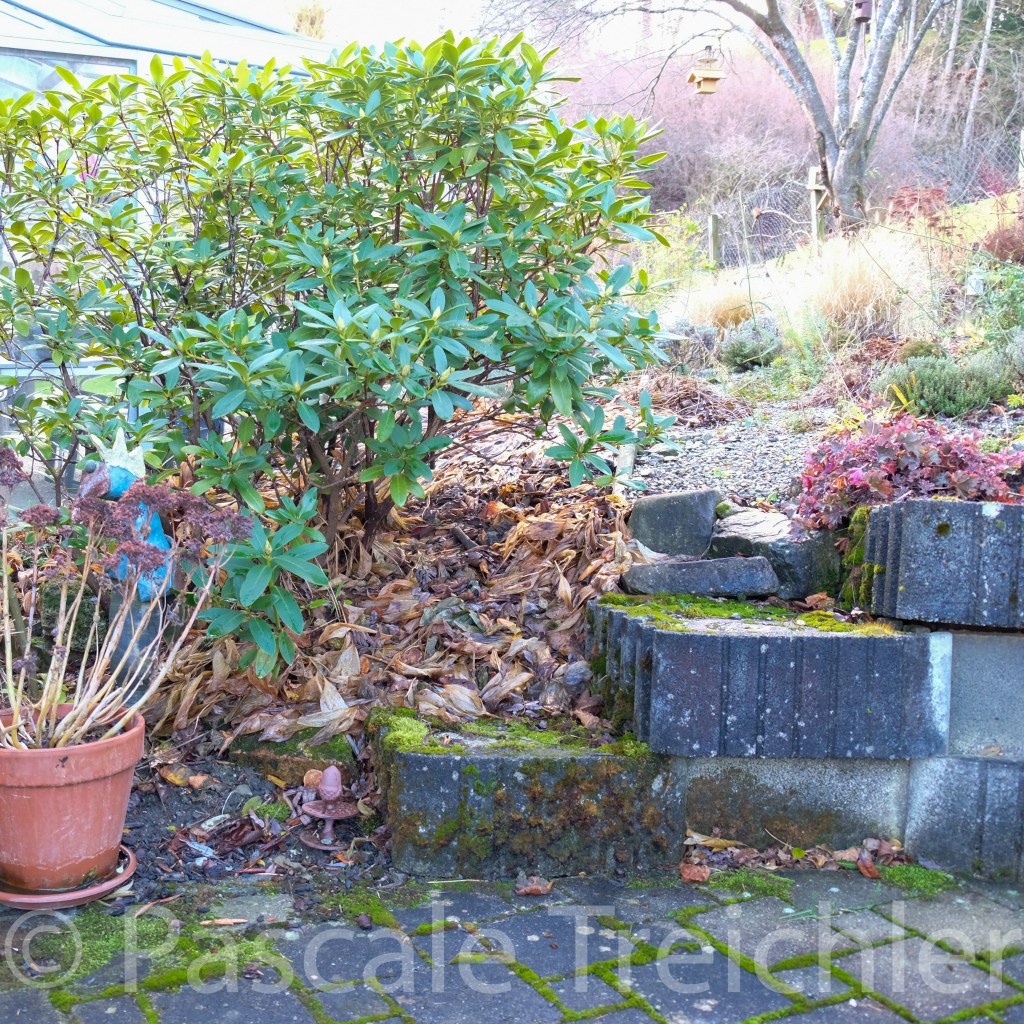 Die vorherrschenden Farbtöne sind dunkelgrün und braun. Die Hortensien sind verschrumpelt. Ich werde die vertrockneten Blütenbälle jedoch erst im Spätwinter wegschneiden um jetzt keine Frostschäden zu verursachen.