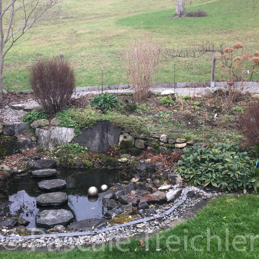 Der Teich fast entlaubt. Sobald die „letzten“ Blätter (es gibt ja doch immer noch welches an den Bäumen) unten sind, nehme ich den Laubrechen und fische das Laub heraus. Es ist ein gutes Mulchmaterial in den Beeten rund herum.
