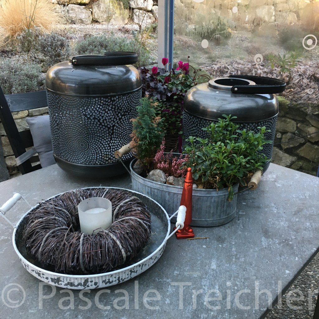 Die Terrasse schmückt sich mit zwei riesigen Laternen, einem trockenen Kranz mit Kerze und einem leuchtend orangen Weihnachtsmann. In den Töpfen kommt durch die Pflänzchen noch etwas Farbe dazu.