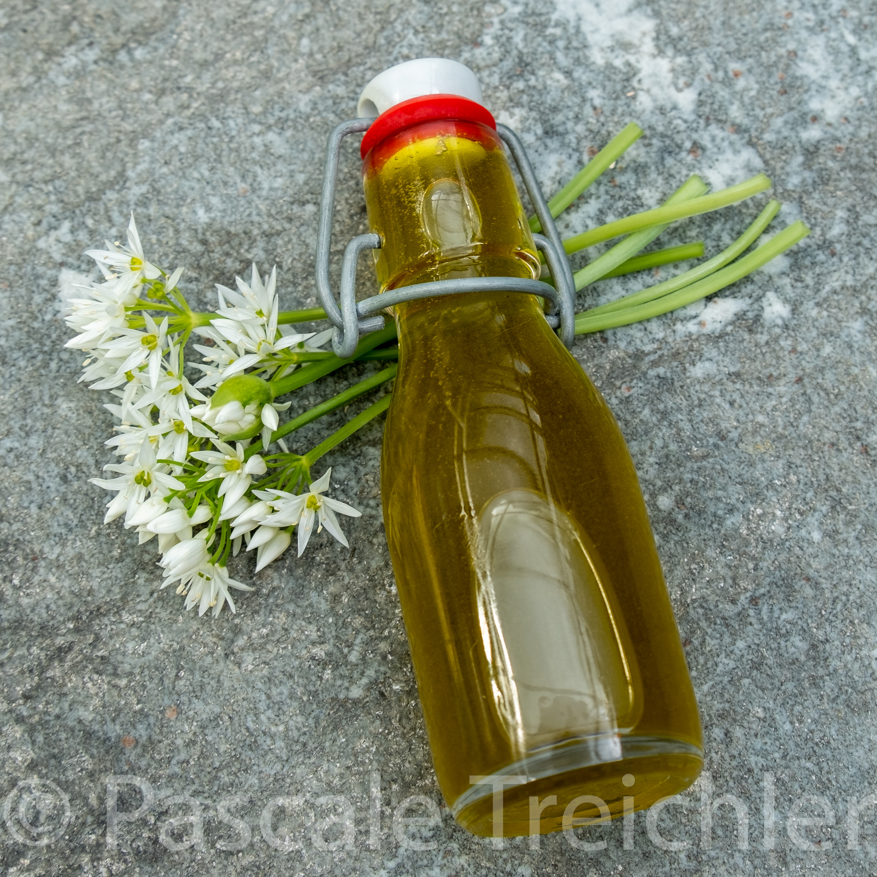Von den Bärlauchblüten setzen wir Bärlauchblütenöl an. Einfach die Blüten in eine leere Flasche füllen und mit gutem Olivenöl übergiessen. Mehrere Wochen stehen lassen, so dass das Öl den Geschmack gut annehmen kann. Schmeckt z.B. auch toll zu Pizza (statt dem scharfen Chilli-Öl).