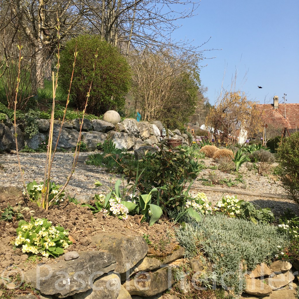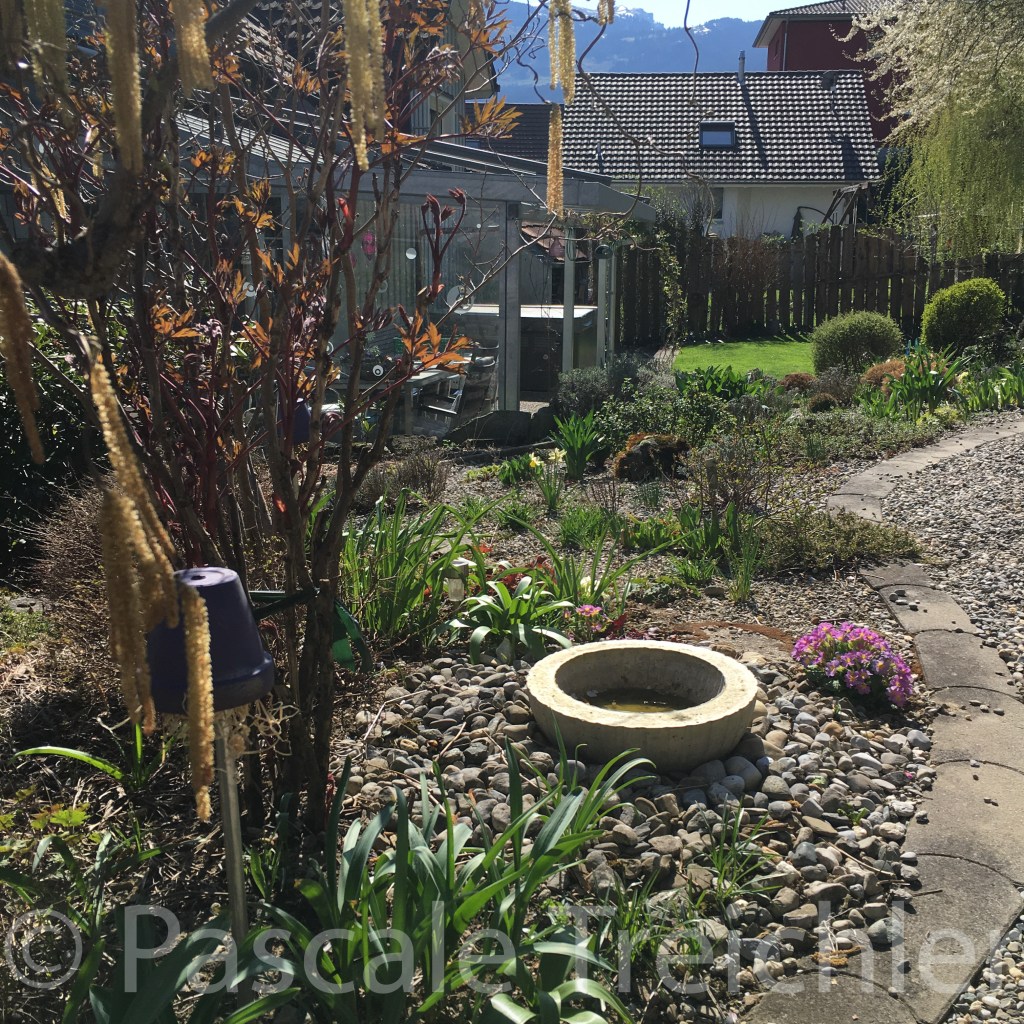 Hier hat den ganzen Monat die Kornellkirsche geblüht und viele Insekten ernährt. Auch an den vielen Primeln haben sie ihre Freude. Das ganze Beet summt, wenn die Sonne scheint.