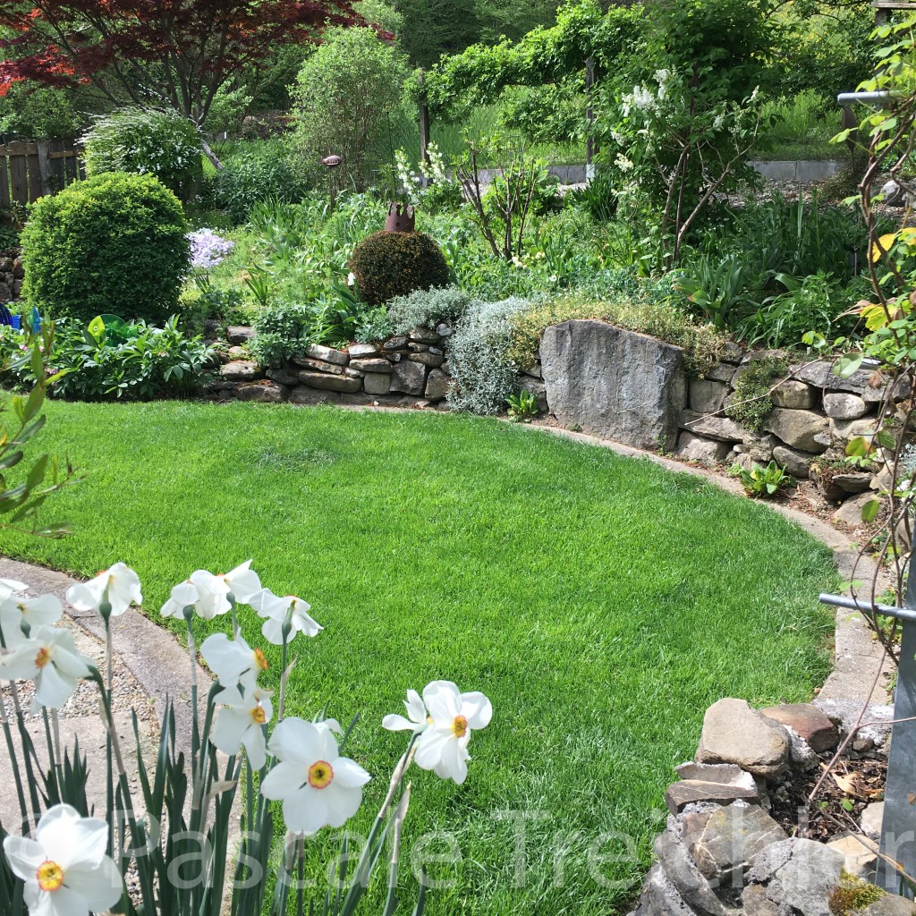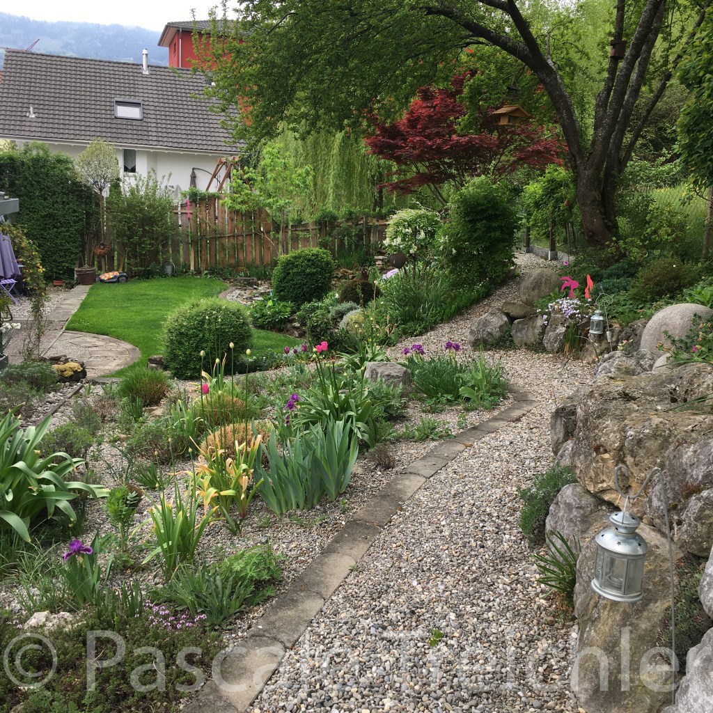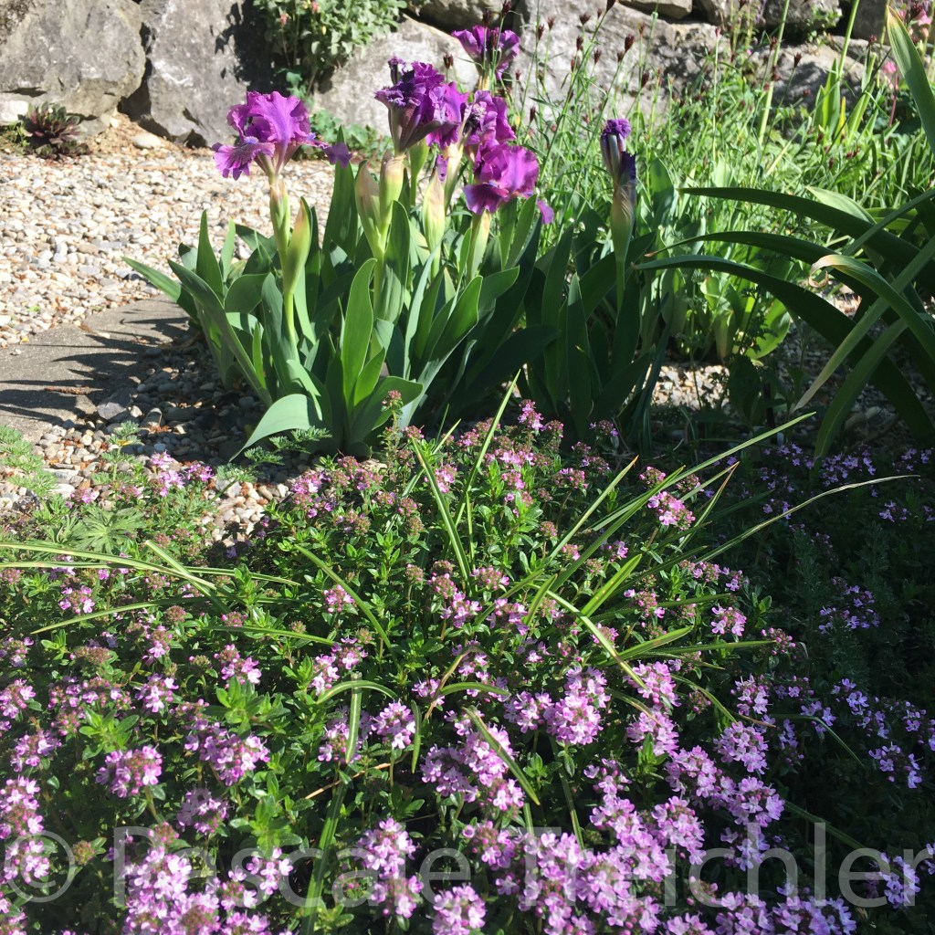 Im Kiesbeet haben die Tulpen etwas Farbe gebracht. Die Iris sind fanstastisch im dunkelvioletten Kleid aufgetreten. Sie wurden unterstützt von Polsternelken, den ersten Akelai und dem Zwergflieder.