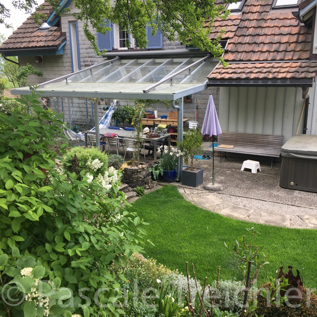 Die Terrasse ist bereits im Sommerbetrieb. Am Nachmittag wurde es bereits so heiss, dass wir die Sonnenstore benutzen.