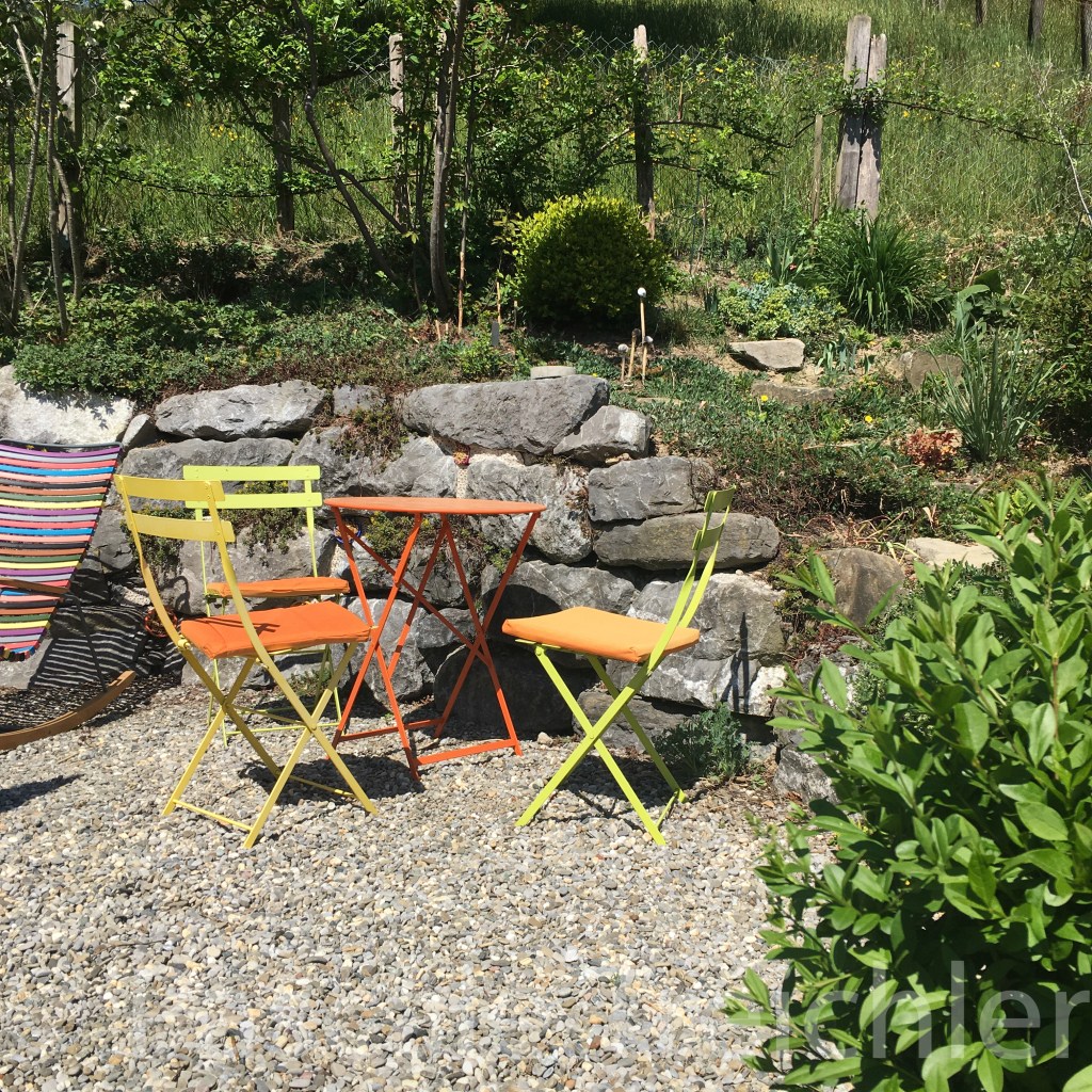 Etwas Frühlingsdeko und schon wird der kleine Schattensitzplatz freundlicher. Vielleicht sollte ich den Platz umtaufen in Raucherplatz, denn mein Mann hat ihn für sich und seine Sargnägel entdeckt…