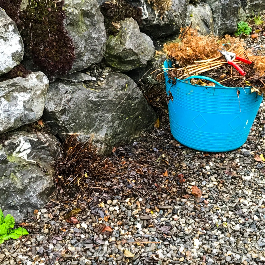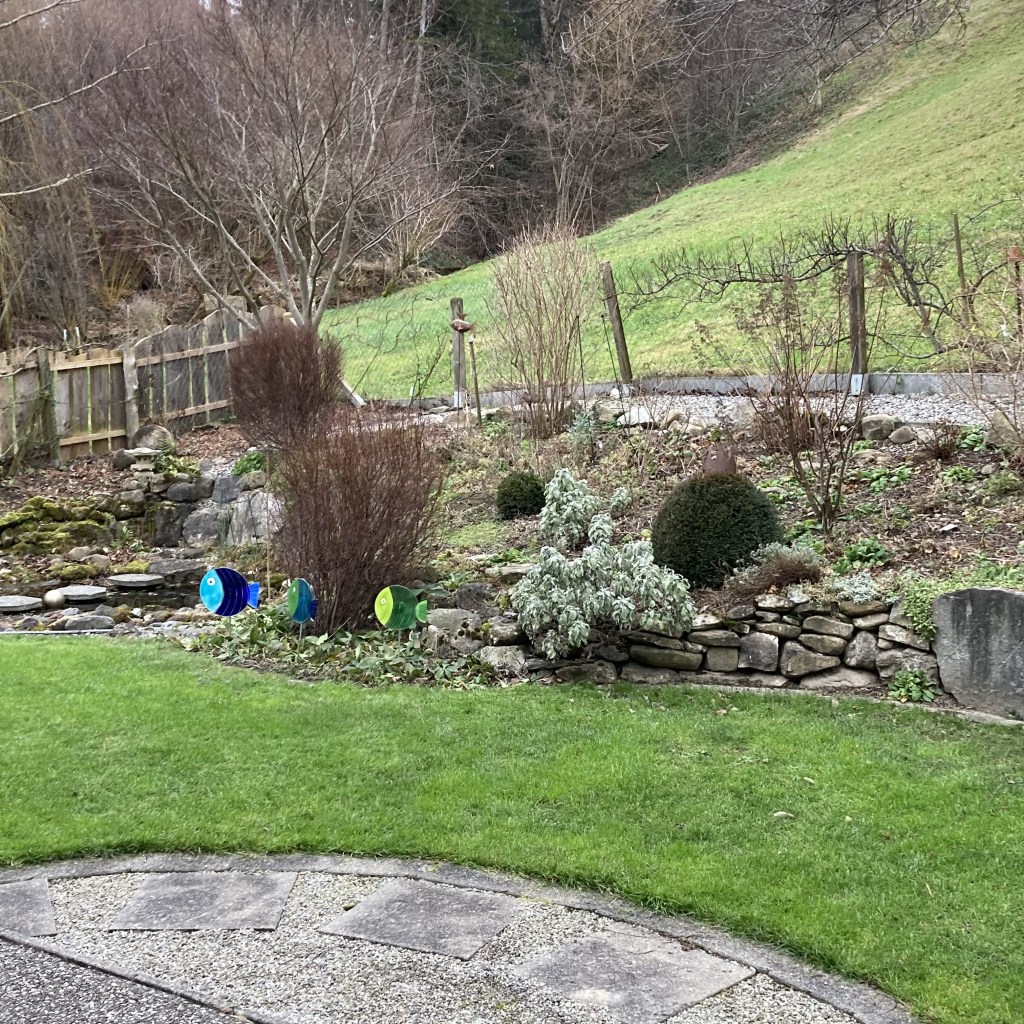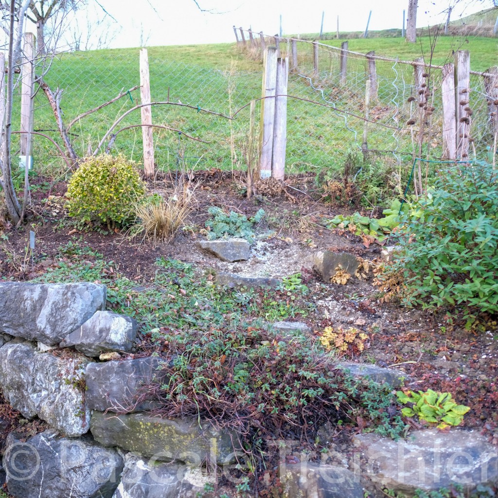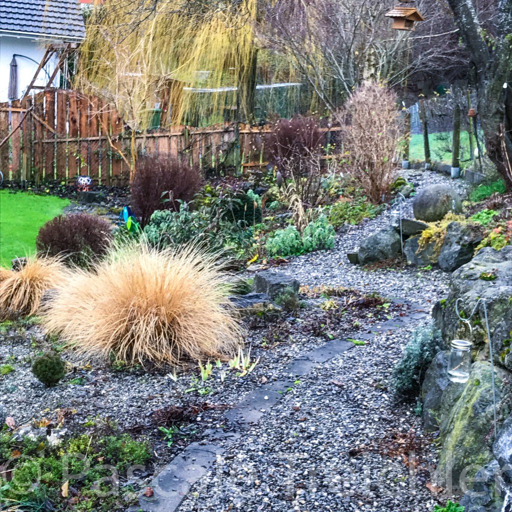 Im Kiesbeet ist Winterpause. Die Gräser schneide ich an einem trockenen Vorfrühlingstag mit der Heckenschere, kurz bevor die saftigen neuen TRiebe kommen. Hier habe ich alle Storchenschnabel geschnitten, da die Triebe über den Winter bloss faulen und keinen Unterschlupf bieten.
