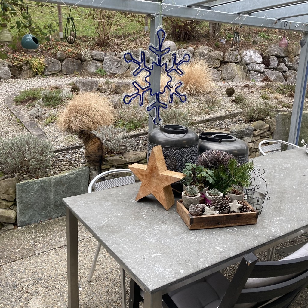 Auf der Terrasse haben wir etwas Winterdeko drapiert. Sonst wird sie bis zu den wärmeren Tagen nicht genutzt. Obwohl, doch als Kühlschrankerweiterung ist sie immer wieder gut 🙂