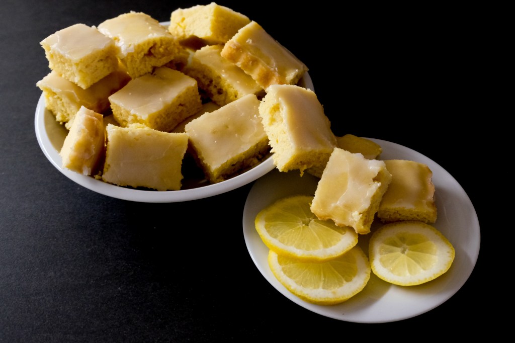 Meine Tochter nennt die Dinger Lemonies. Ich finde den Namen super. Es ist eigentlich ein flacher Zitronencake der in Würfelgeschnitten wird und danach wie gelbe Brownies aussieht.