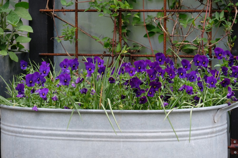 vor dem Gewächshaus begrüssen uns Blüten in einer alten Zinkwanne.
