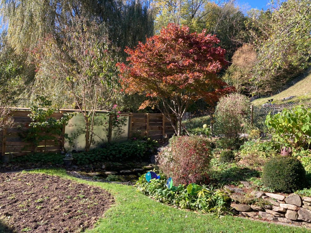 Der Teich gedeiht von selbst. Hier fische ich nur ab und zu Blätter raus und im Herbst Wasserpflanzen die zu stark gewachsen sind. Sonst überlassen wir ihn den Molchen und den kleinen Teichbewohnern wie den Libellenlarven und Co.