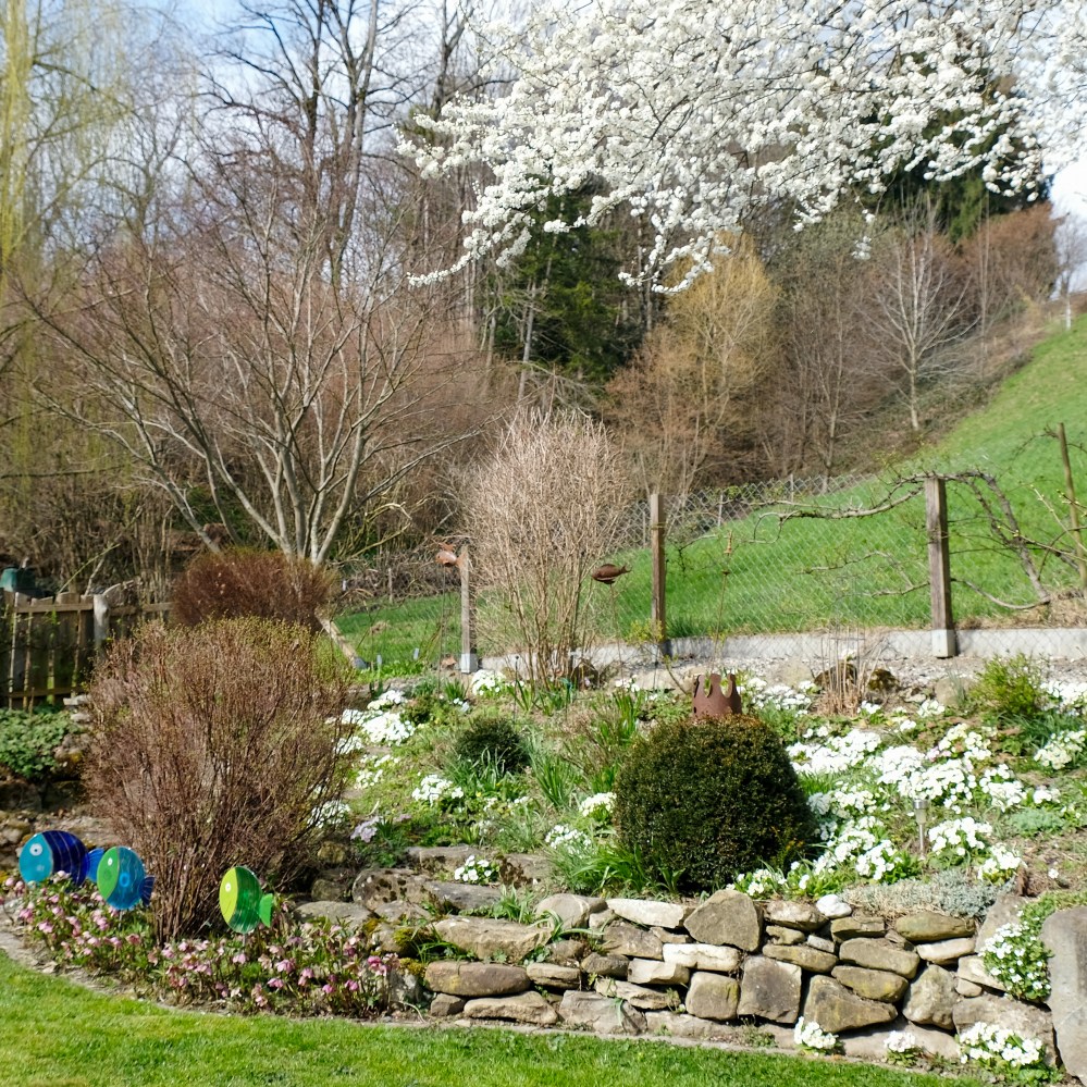 Im grossen Rasen vor dem Teich planen wir eine Staudenwiese in Weiss. Ich habe den Rasen im letzten Jahr dort nur 2 mal gemäht. Leider kam dabei kein Wildwuchs, nur das Gras wurde sehr hoch. Im Herbst habe ich den Bereich umgestochen und die Gassoden entfernt. Bereits dann habe ich Blumenzwiebeln gesteckt. Jetzt erst habe ich einige Primeln geteilt und ebenfalls dorthin umgepflanzt. Gesehen habe ich, dass Schafgarbe, wilde Möhre, Gänseblümchen und Margariten sich zeigen. Alle vier hatte ich im Herbst aus der Obstwiese entfernt und hier gepflanzt.