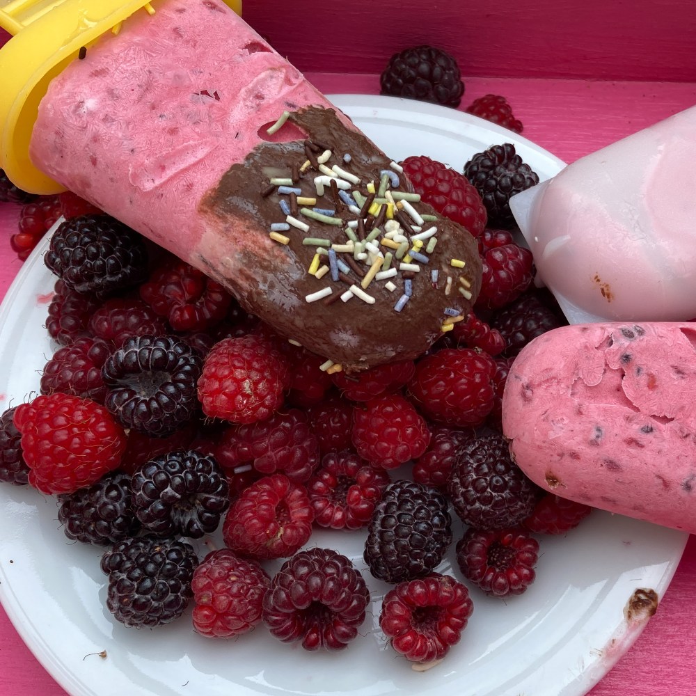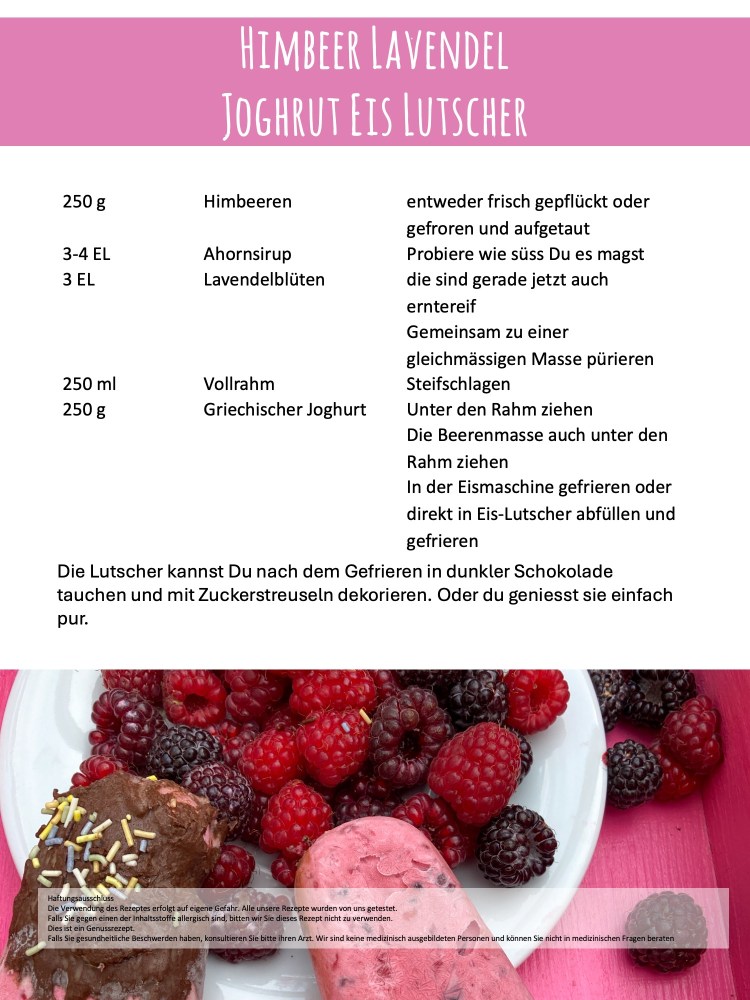 Wir haben gerade eine richtige tägliche Himbeer-Schwemme. Damit ich sie nicht einfach nur gefriere bis ich Zeit habe sie zu verarbeiten, habe ich am Wochenende daraus Eislutscher gemacht. Die Lutscher können wir über die nächsten Wochen nach und nach geniessen.