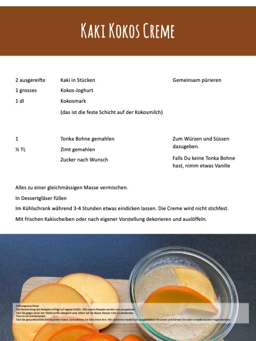 Tönt lecker oder? Bitte beachte, dass eine Creme nicht stichfest wird. Zur Dekoration kannst Du natürlich auch weitere feine Früchte verwenden. Gerade für Weihnachten bieten sich zum Beispiel kandierte Kumquats oder geschnittene Dattelstücke an. Sicher bist Du da viel kreativer als ich.
